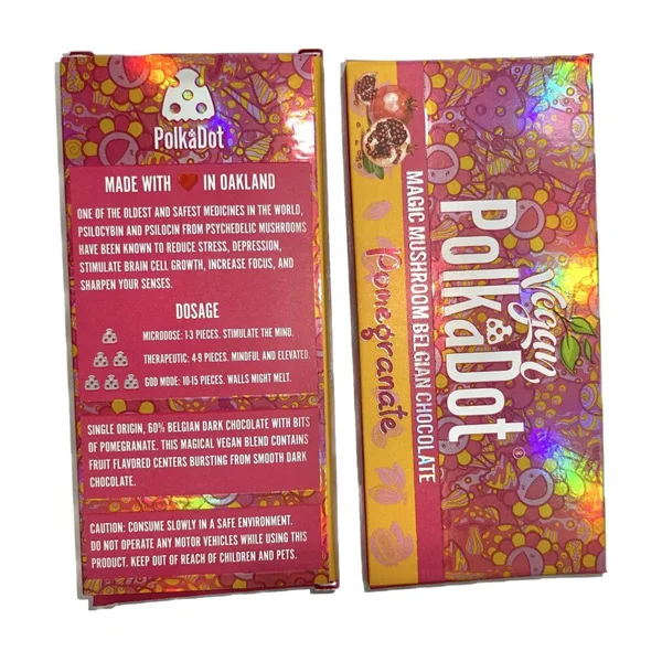 Buy PolkaDot Pomegranate online. chocolate bars is a mushroom chocolate bar that originated from the famous Polka Dance. The shroom chocolate bar is also popular known as the Magic Belgian Chocolate. The polka dot mushroom chocolate bars are crave-worthy choco shrooms that helps you conquer your day and also make it adventurous. However, these experiences depends on the dosage the customer chooses to consume. Just like every other mushroom chocolate bar, the main ingredients used in the production of these polkadot chocolate bars are psilocybin and chocolate. Polka dot chocolate mushroom is very famous amongst fans of micro dosing. The chocolate bar hides the fungi flavor and you can eat one square at a time. Polkadot magic chocolate